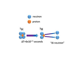 To make 5H, the researchers used a reaction that removed a single proton from energetic 6He nuclei produced by the National Superconducting Cyclotron Facility at Michigan State University traveling at 33% of the velocity of light. By analyzing the reaction products, the team could determine not only the lifetime of the resulting 5H, but also the amount of energy released when the 5H disintegrates. In 6He, sophisticated calculations have already shown that the two of the four neutrons travel together around a tightly bound core made up of two protons and the other two neutrons. Those calculations are unable to describe fully a system that is as short-lived as 5H, but with some approximations can begin to give a picture of its internal structure. It was found that as the system breaks up, the neutrons retain a memory of how they were arranged in the original 6He nucleus, and that the two that fly away may emerge together in a state sometimes called a "di-neutron" that quickly separates into two neutrons. The work will help guide the development of theories describing neutron interactions and the properties of very short-lived nuclear systems.